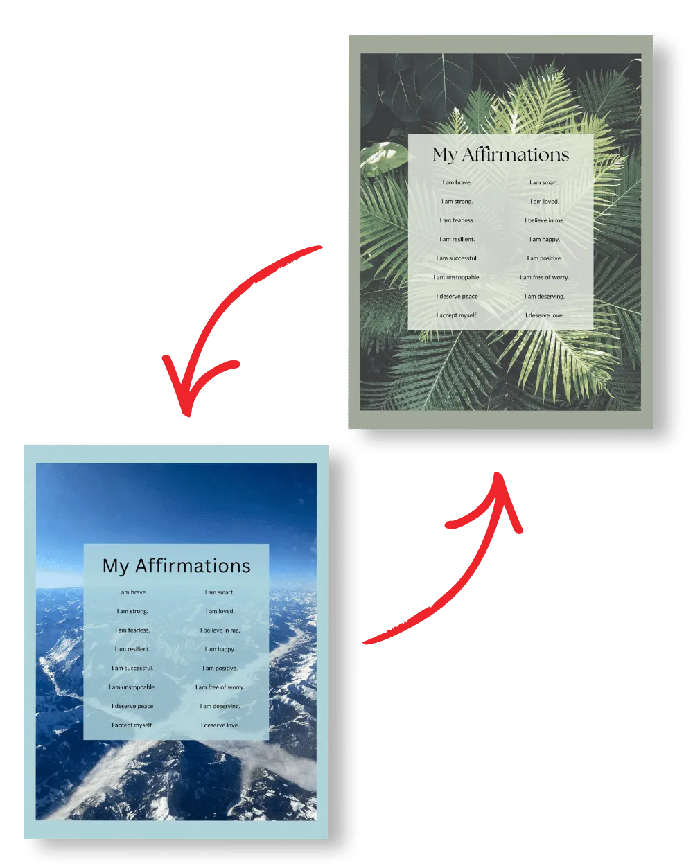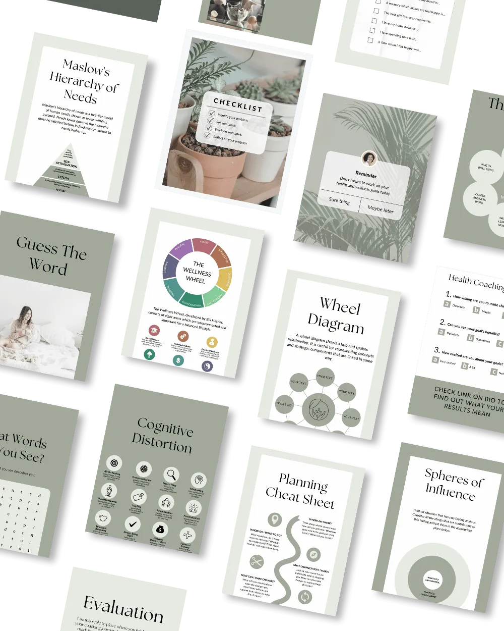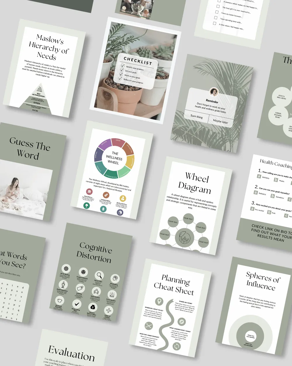 Create motivational resources such as Wheel of Life worksheets, affirmation cards, habit trackers, and wellness challenges with beautiful, customizable designs.