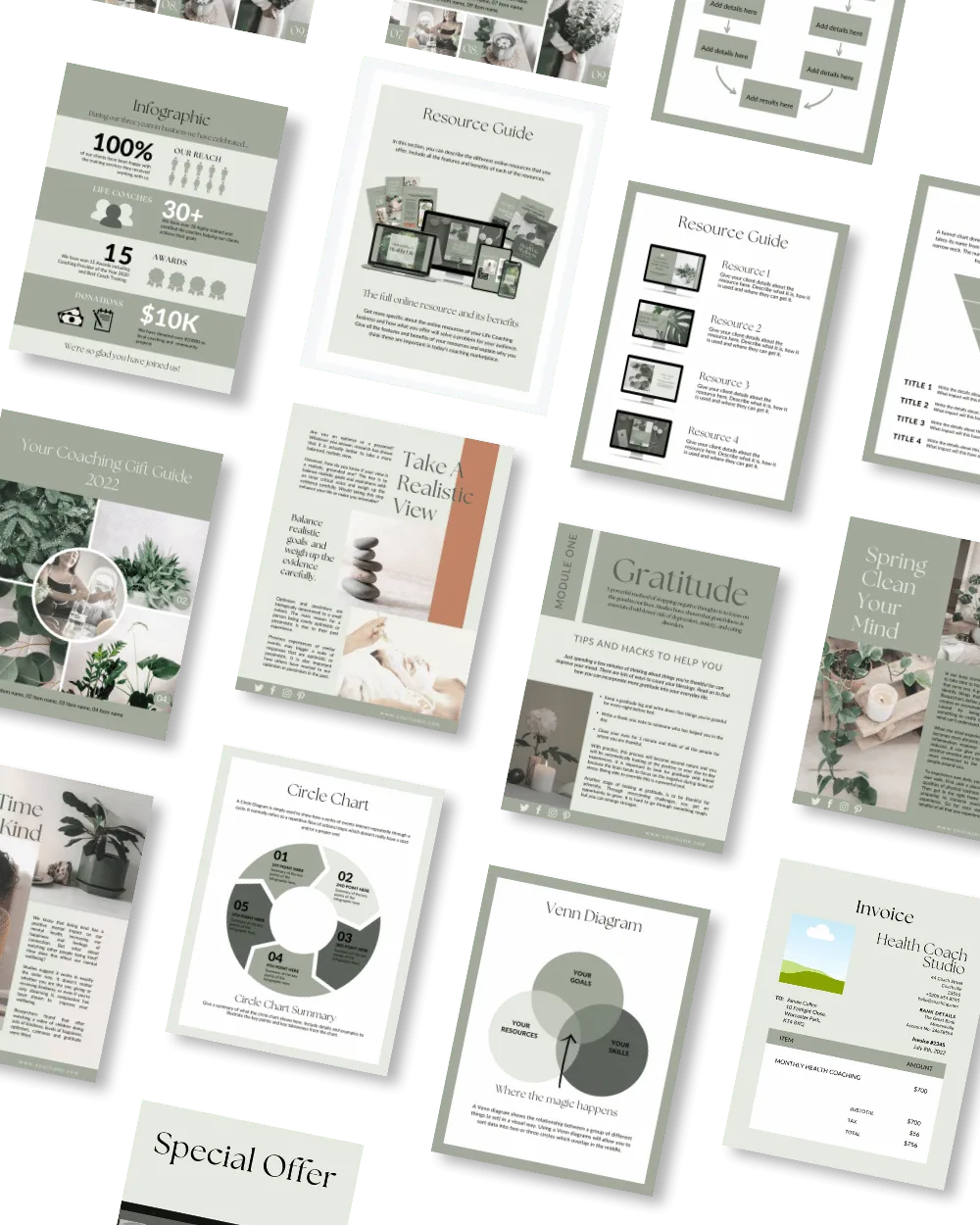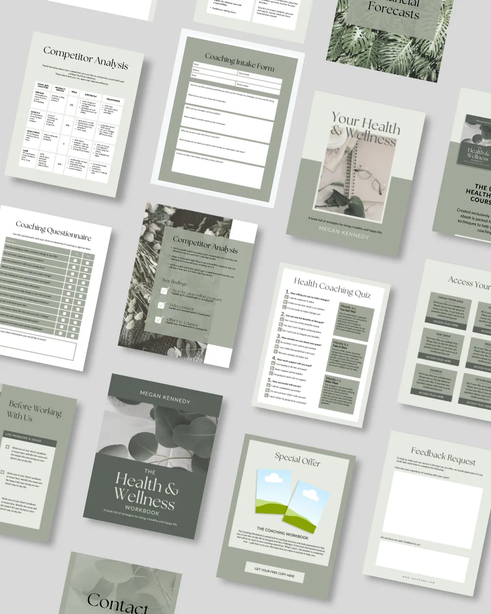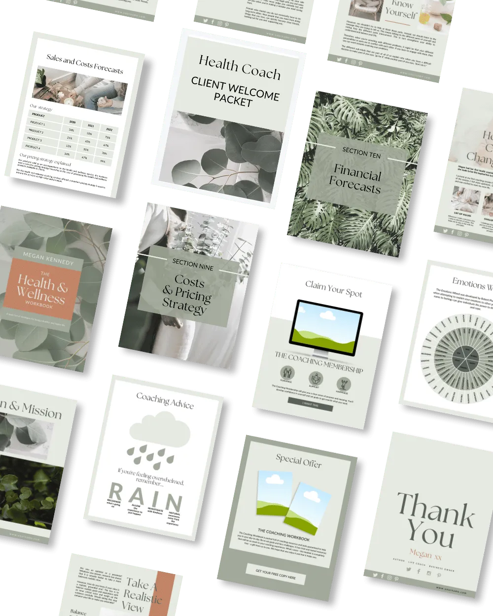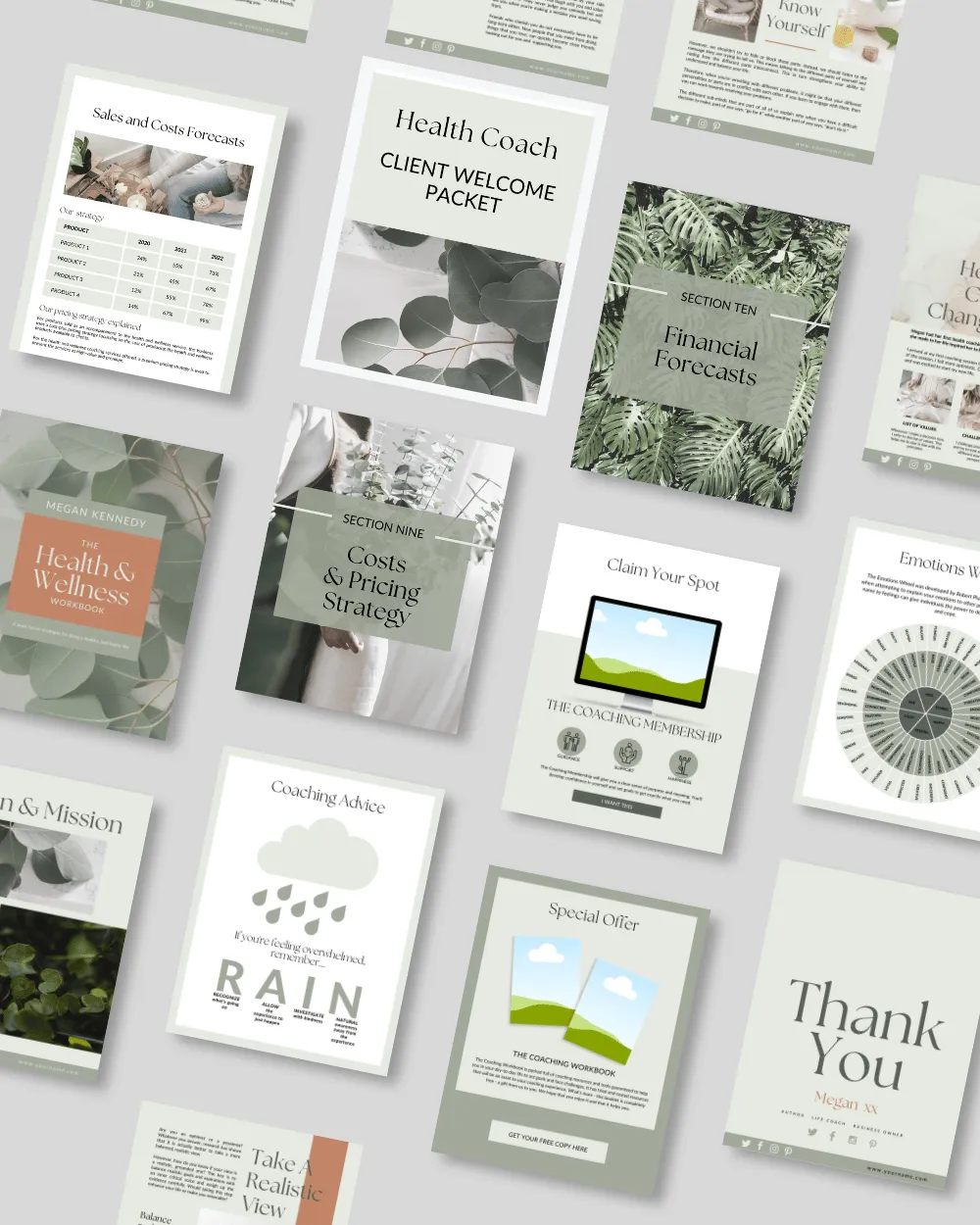 Build a thriving practice with client welcome/goodbye packets, pricing guides, forms, and lead magnets like workbooks and trackers to support client transformations.